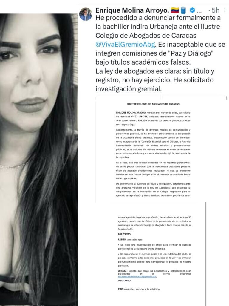 «He procedido a denunciar formalmente a la bachiller Indira Urbaneja ante el ilustre Colegio de Abogados de Caracas (@VivaElGremioAbg)», anunció Molina Arroyo en su cuenta de X. El docente, conocido por su activismo en defensa de la legalidad, argumenta que Urbaneja se presenta como abogada en espacios mediáticos y políticos sin poseer la colegiatura requerida para ejercer la profesión.